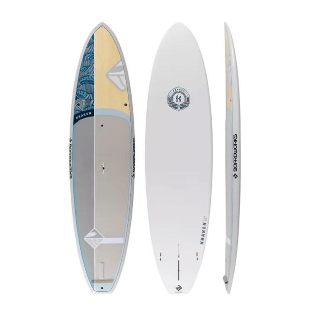 The The Kraken is a great all-around paddle board that's stable, maneuverable and easy to transport. This hard paddle board is set up with a single, tri-fin or quad-fin option, allowing the rider to choose between a center only fin for cruising or adding side bite fins to enhance the surfing experience. With our enhanced hand finished epoxy sandwich bamboo construction, this SUP comes in three sizes 9'9 -, 10'3 - & 11'0 - . The Kraken stand up paddle board is a solid choice for both beginners and experienced paddlers. Boardworks Kraken received both shape and graphic refinements this year.